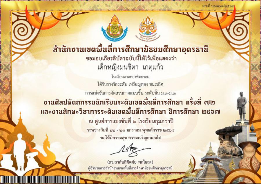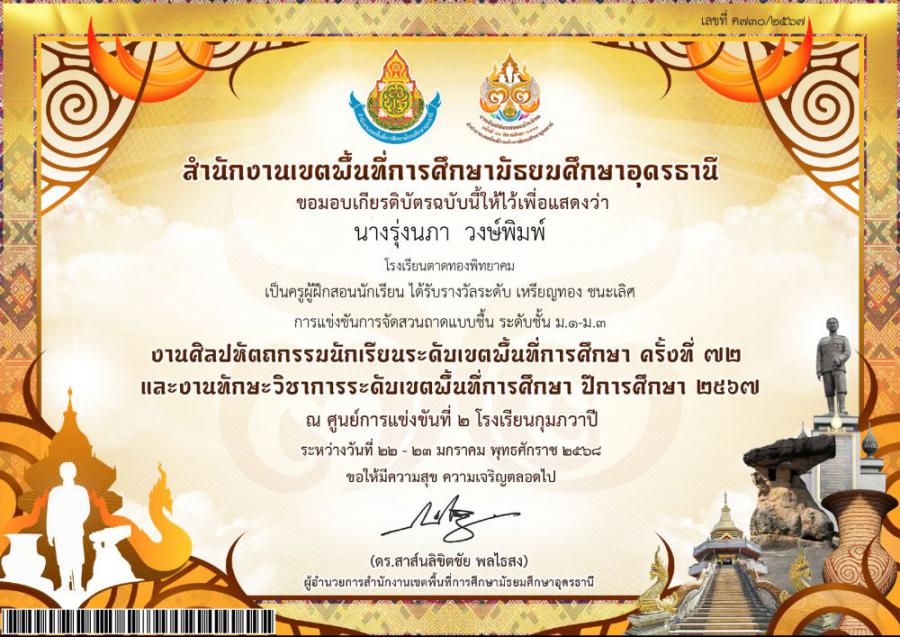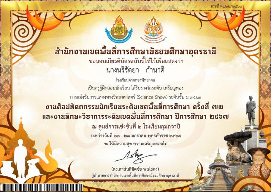 วันที่ 22 มกราคม พ.ศ. 2568 นำโดยนายวัชรินทร์ ประเสริฐสังข์ ผู้อำนวยการโรงเรียน คณะครูและบุคลากร ได้นำนักเรียนตัวแทนเข้าร่วมแข่งขันกิจกรรมทักษะวิชาการ งานศิลปหัตถกรรมนักเรียน ครั้งที่ 72 ณ โรงเรียนกุมภวาปี โดยได้ส่งนักเรียนเข้าร่วมแข่งขัน จำนวน 5 รายการ ดังน้ี สวนถาดชื้น ม.1-3 , ออกแบบสิ่งของเครื่องใช้ ม.1-3, ออกแบบสิ่งของเครื่องใช้ ม.4-6, การแสดงทางวิทยาศาสตร์ (Science Show) ม.1-3, การแสดงทางวิทยาศาสตร์ (Science Show) ม.4-6 (นักเรียนได้รับรางวัลเหรียญทองทุกรายการ) S:0